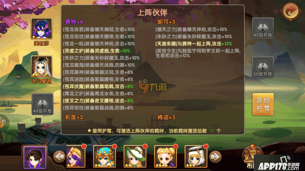 没有最强的伙伴,只有最强的组合。除了赛特主角之外,可以带上5个伙伴,以及5个护驾和1个替补.护驾主要是为了羁绊效果,可别小看那些8%、10%的效果,到后期战力加成还是非常可观的。