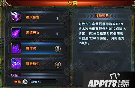 对敌方生命最低目标造成113%法术攻击伤害额外附加固定法术伤害(伤害随技能等级提升),有30%几率对其他随机单位造成50%伤害,消耗法力150点。耗蓝低,PK刷图必备,建议破天释放以后看情况释放。