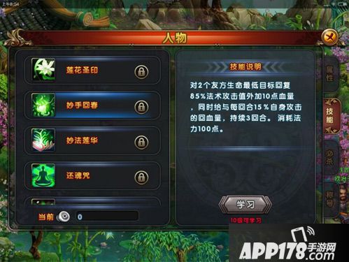 妙手回春(10级可学):对2个友方生命最低目标恢复85%法术攻击外加额外的血量,额外恢复随技能等级提升而提升,同时给予每回合15%自身攻击的回血量,持续3回合。消耗法力100点。