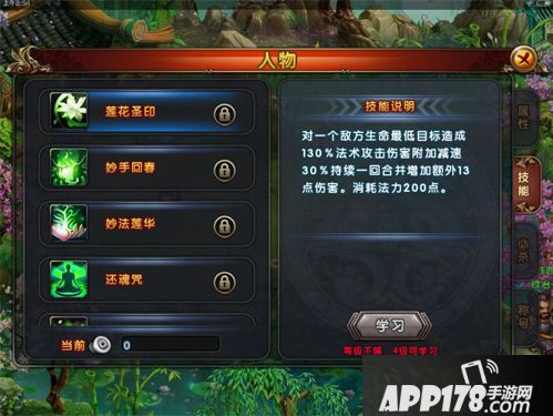 莲花圣印(4级可学):对一个敌方生命值最低目标造成130%法术攻击伤害附加减速30%,持续一回合,并额外增加伤害,额外伤害随技能等级提升而提升。消耗法力200点。