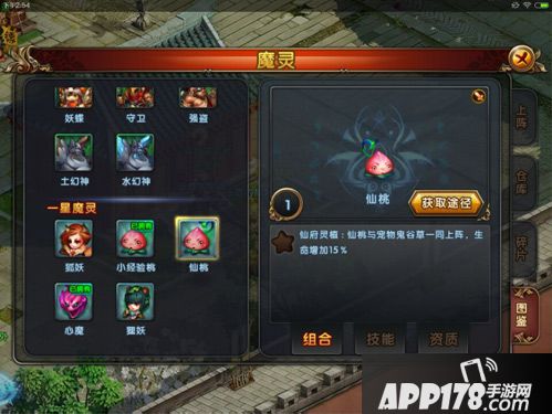 组合:仙府灵植,仙桃与宠物鬼谷草一同上阵,生命增加15%。