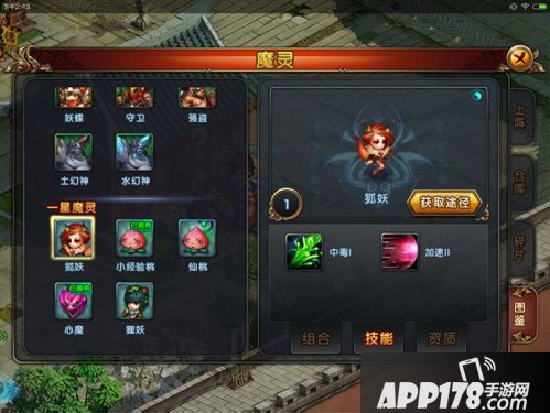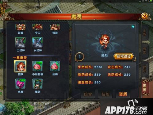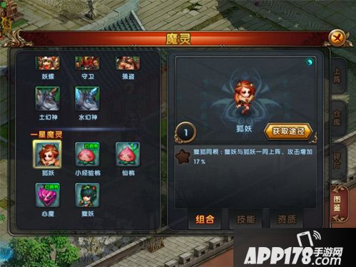 组合:也就是缘分,如果狐妖和狸妖一起上阵,就会增加攻击17%哦,搭配起来才好用嘛。