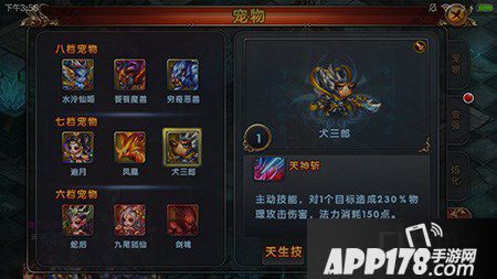 天神斩:主动技能,对1个目标造成230%物理攻击伤害,法力消耗150点。这个相当于暴击技能啊,有机会直接秒杀对手啊,要是伤害高的话,基本直接秒。