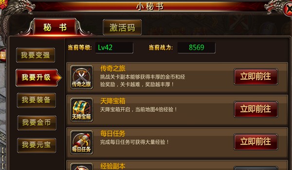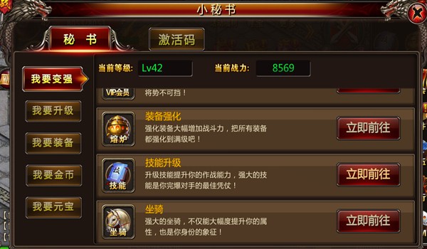 首先通过小秘书界面可以看到,我要变强、我要升级、我要装备、我要金币、我要元宝五个大秘籍。