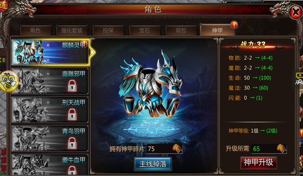 同时,我们的神甲能够升级,等级越高,增加防御类属性会越多,战力自然会越强。升级神甲需要消耗神甲碎片,这些碎片我们在通关主线副本里面获得,不必太担心碎片不够哦。