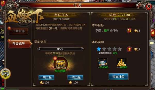 首先是要开启跑环任务, 当我们角色40级后,并且加入帮会后就能够领取到跑环任务了, 废话不多说,当小编开启到跑环任务后,立马就去领取任务,然后领取到一个打10只僵尸的任务,小编再策马扬鞭到僵尸洞里轻松放几个技能就完成了任务,再打开跑环任务界面点“领取奖励”,总体上完成起来非常简单。