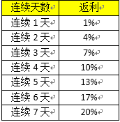 【活动内容】:活动期间,连续充值元宝会获得相应元宝返利,连续充值天数越多返利就越多,机会非常难得!如中断连续充值,则按所充连续天数返还比例结算(如连续充值3天返利7%),返利元宝在活动结束后以系统邮件形式发送。