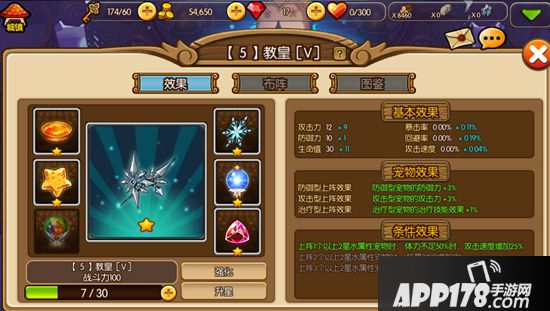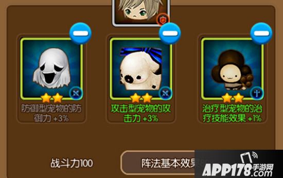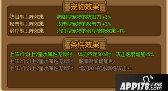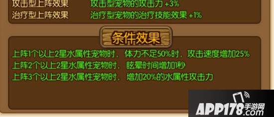 与上文说到的宠物效果同理,阵法的条件效果也要对应相符的条件才能触发。以“教皇”这个阵法来说,阵法的条件属性需要对应条件的宠物属性才能触发。那么怎么看宠物的属性呢?原来,每个宠物在拥有属于自己的类别图标之外,还有自己对应的背景颜色,而那个颜色则就代表了宠物的属性:蓝色代表水属性;红色代表火属性;绿色则代表了木属性;白色不具有属性。