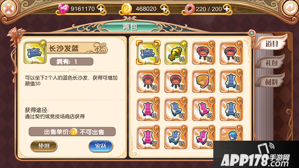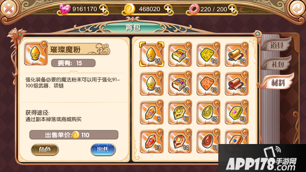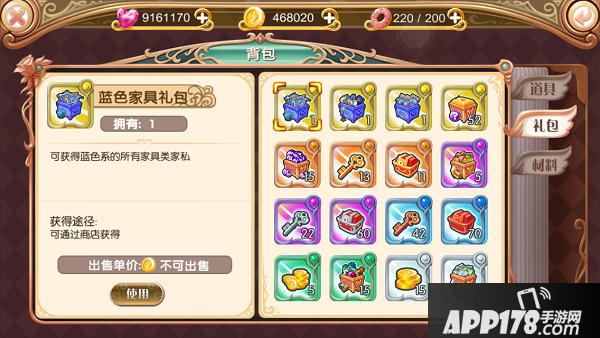 背包内容纳了你所获得的一切物品,可直接在主界面点击背包按钮进入,分为道具、礼包、材料三类。