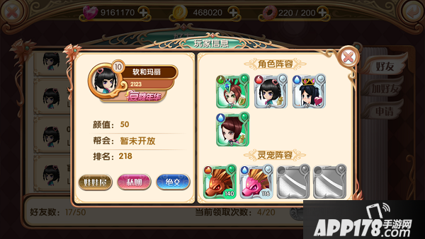 点击好友即可打开详细信息,可以选择逛好友的娃娃屋,私聊,以及断绝。你也在好友列表内可以选择跟好友切磋玩玩哦,多交好友有利无弊,还可以在类似星座副本等活动助你一臂之力哦!