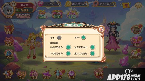 【激活码】按钮可用于领奖,【返回登陆】按钮则可退回登录界面切换账号,点击【游戏设置】,可以按自己的喜好确定是否开启音乐音效跟提醒哦~