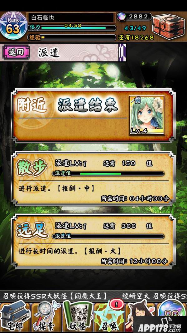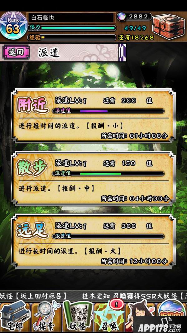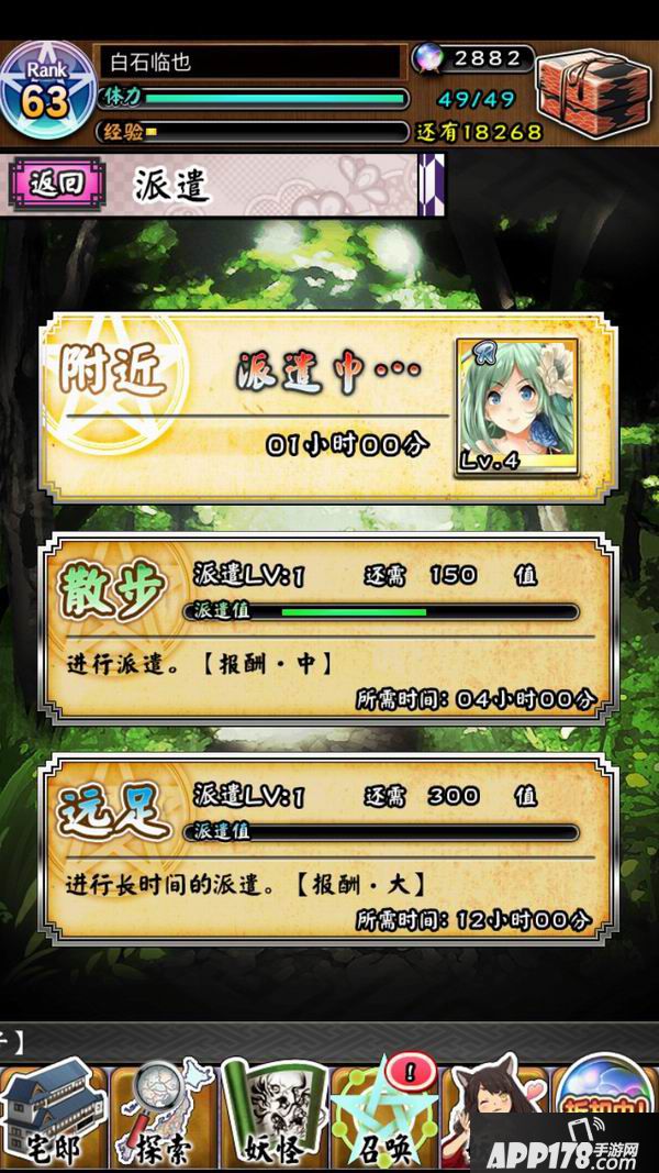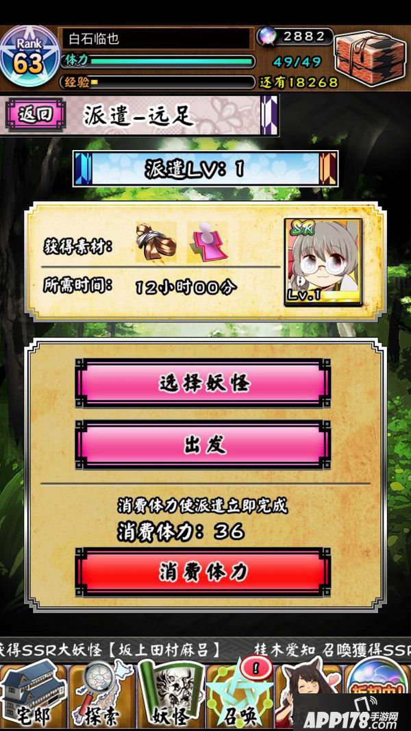 派遣可以选择一只妖怪在一定时间内到达目的地获得素材,残余时间可以透过消费体力缩短后即时完成。