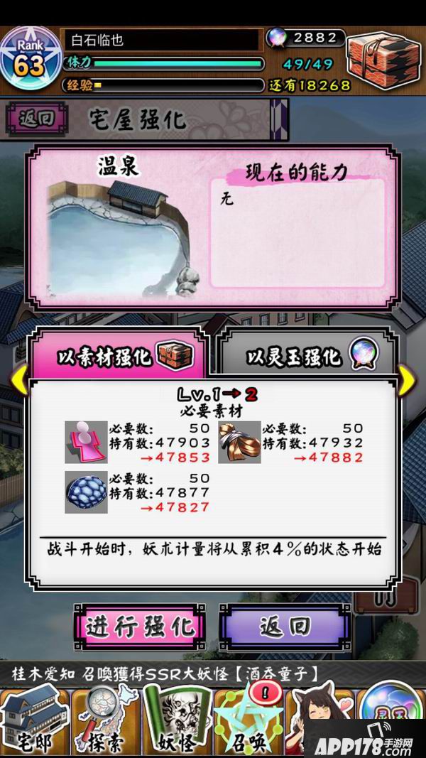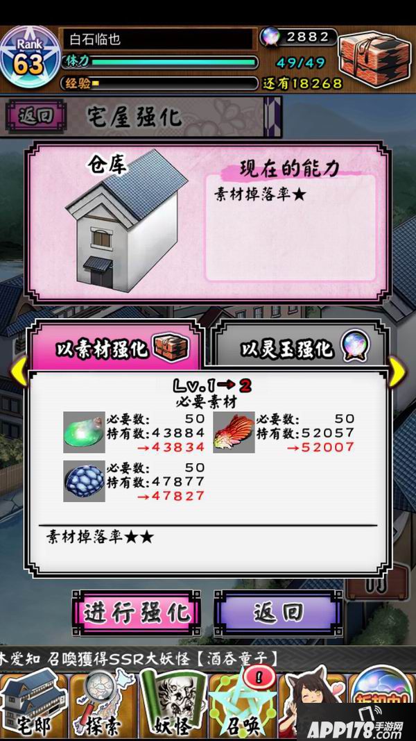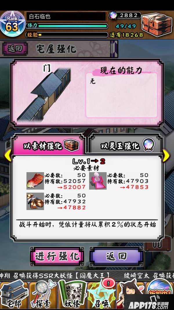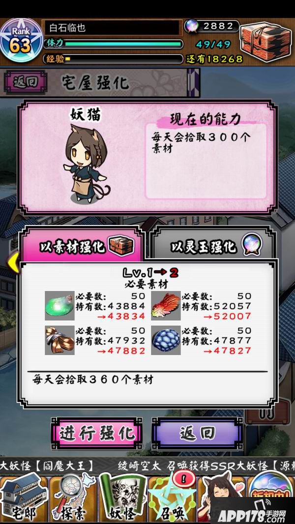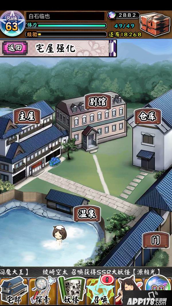 宅屋包含了[主屋][仓库][别馆][温泉][门]5项设施及化猫,可以消费素材及灵玉进行强化获得各式各样的额外报酬。