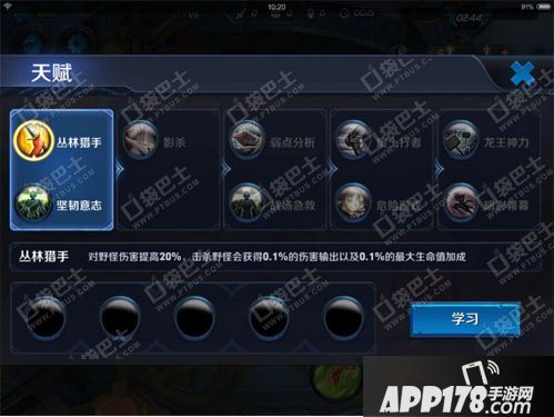 天赋方面,一级的时候,如果要去打野,肯定选择丛林猎手,如果一开始就打架,而且对方有控制型的英雄,肯定还是要选择坚韧意志的,之后建议学习弱点分析,提升自己的输出,当然,有人说站得住才有输出,不过小编认为,战场急救这个天赋,20%的生命值,而且CD90S,意义并不是很大。第三个天赋,如果想让自己一波的伤害更高,选择废土行者,如果想让自己能够持续的输出,选择危险游戏,这都是没有问题的,最后一个天赋,如果想让输出更高,可以选择龙王神力,如果想让输出更久,可以选择暗影帷幕,不过小编还是觉得,龙王神力更好。