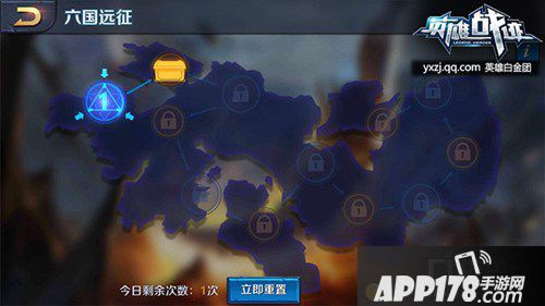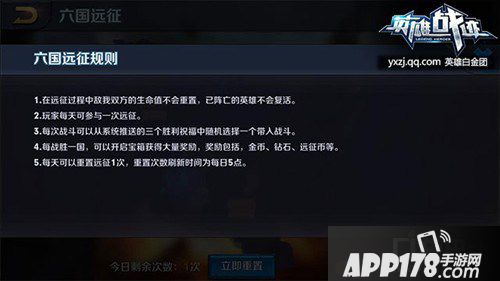 六国远征玩法是一个不可重置敌我双方生命值的玩法,并且已阵亡英雄不能复活,这就需要考验玩家的布阵技巧了。每天每位玩家可以参与一次活动,每次战胜一国都可获得宝箱的大量奖励,包括金币、道具、钻石、远征币,每天可以重置远征1次,凌晨五点刷新,玩家要注意刷新的时间,以免错过了通关六国远征的机会。