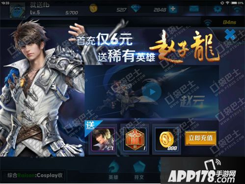 这种英雄不多,貌似目前30个只有赵云一个吧,咳咳,那么,充值就可以获得,首充6元就送第一美男子赵云哦!