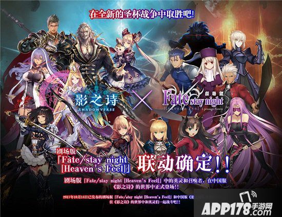 此次联动中,《剧场版Fate/stay night[Heaven's Feel]》的部分人气御主与英灵角色将以主战者皮肤、卡背、称号以及头像的形式加入《影之诗》游戏。