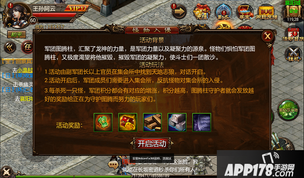 2.军团长和副军团长,可以通过消耗军团资金来开启怪物入侵活动(军团资金不足,可以使用元宝开启)。每天只能开启1次。