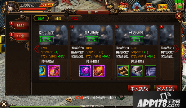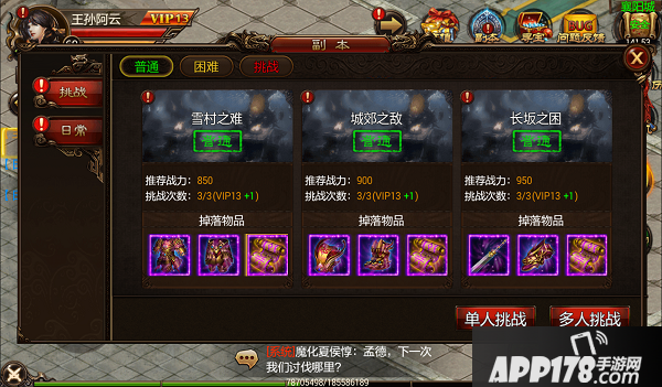 每个副本每天有两次挑战机会,vip角色有次数加成。挑战副本掉落紫色装备和挑战卷轴。挑战卷轴是挑战个人boss必备的消耗物品。