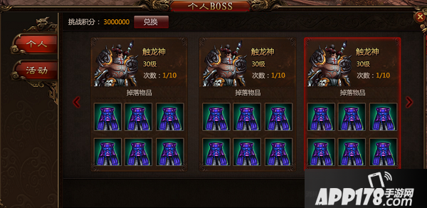 进入英雄塚战胜个人BOSS,有机会获得橙色装备。不同等级的个人BOSS掉落不同的专属橙色装备。进入个人BOSS场景需要消耗挑战卷轴