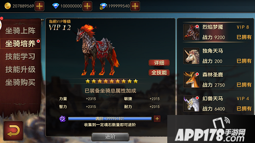 1、 区别于一般的游戏,永恒中直接采用坐骑相应的魂石进行培养、进阶,而且是百分百成功哦!星级越高,对主角的战力加成越多。