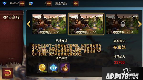 28级开启的夺宝奇兵是一个活动副本,玩家每天可以挑战两次,通过击杀副本中出现的抢夺资源的强力怪物可以获得宝石、金币以及大量经验,还有可能掉落装备。单人或者组队都是可以的,不过在这里还是推荐组队进行,因为副本中还需要掠夺怪物的资源,毕竟人多力量大啊!在副本中注意守护好己方的资源,不能被前来抢夺的怪物靠近抢夺成功,同时队友还要深入敌方掠夺敌方资源,团队配合才能更好的完成挑战!