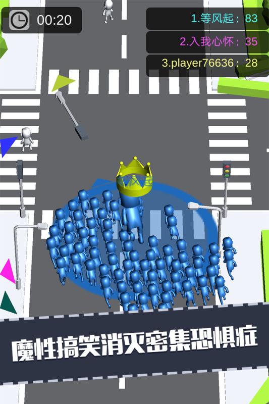 这是一款趣味魔性的休闲益智竞技手游,游戏画面简单,你需要在一个城市场景中游荡,不断奔跑。 城市中有超多的人,在奔跑的过程中你会遇到许多惊喜,许多和你志同道合的人,他们会加入你的奔跑大军中,你可以从一个人吞噬慢慢变成一群人吞噬,最终成为这座城市中最大的人群。只要遇到比你的军队人数少的队伍,你就可以将对手的人群吞噬,你的人群会变得更大,背后人群数量最大的领导即可获得胜利,收集他们的力量来守护城市吧!