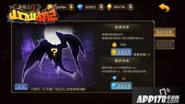 在黑暗之门玩法的主界面中,玩家可以进行探索,并发现各种野外BOSS。探索分两种:消耗金币的普通探索和消耗钻石的噩梦探索。普通探索一般只会出现普通BOSS,有小概率出现噩梦BOSS。噩梦探索则100%会出现噩梦BOSS。