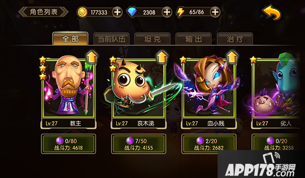 在游戏主界面靠右下方有一排游戏功能选项,点击第一个角色选项,就可以进入英雄管理的界面,打开界面就可以看到所有的英雄。也可以在英雄管理界面中按照当前队伍、坦克、输出、治疗这几项分别查看英雄。