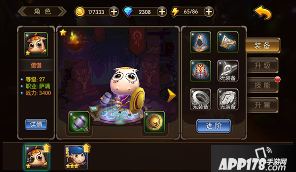 点击选中英雄可以看特定一个英雄的装备、数据、技能等详细属性。在此界面内玩家可以对英雄进行升级、加技能点、升星、进阶以及穿装和装备强化的操作。