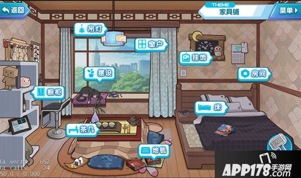 种类分为:窗户、茶几、房间、橱柜、床、挂饰、摆设、吊灯、地毯、窗外景色(不可点击更换);