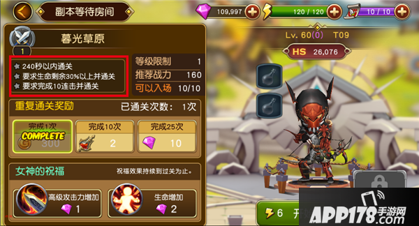 3.在副本等待房间,左侧窗口从上至下分别显示了:副本星级评定条件、推荐挑战战力、重复通关该副本可获得奖励、可使用钻石购买的BUFF。右侧显示当前角色状态,点击“开始冒险”即可开始副本挑战。