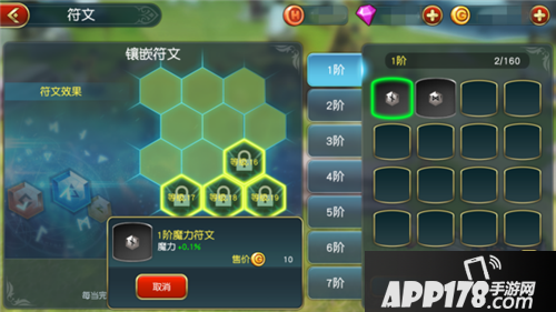 符文方面,玩家购买符文进行镶嵌,能够增加不少属性。符文一共有7个阶位,1阶到7阶,阶位越高符文的效果和附加的内容越好。符文可以进行合成,合成可以帮助你获得更高阶位的符文,值得注意的是6、7阶符文的合成还需要玩家制作合成图案。