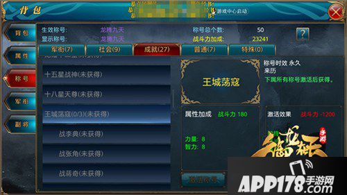 回归正题,王城的四个称号分别为:王城荡寇、战李典、战张角、战蒋奇。这几个称号就要比卧龙城的属性有所提升了。