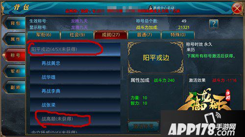 当获得“王城荡寇”这一称号后,我们随着浩浩荡荡的镖车车队来到了阳平关。在阳平关我们总共可以获得六个称号,分别为战华雄、战张梁、战高顺、再战黄忠、再战李典与阳平戎边。