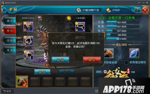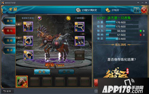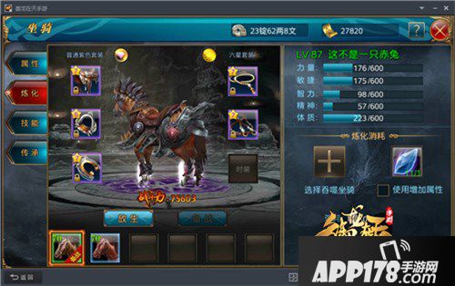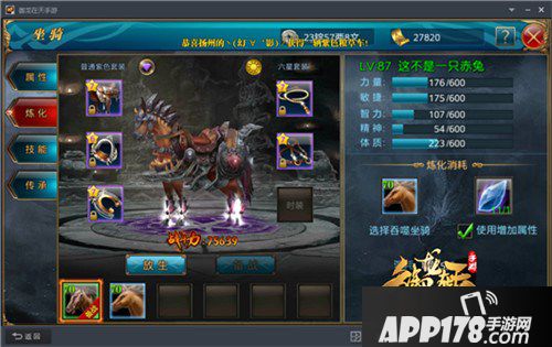 如果想要获得更好的属性怎么办?我们可以在炼化时使用炼化水晶。炼化水晶可以使得马匹在吞噬时必定获得属性增加效果。