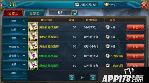 3,寄售行购买,玩家可以实用银子购买其他玩家出售的名将改造符。