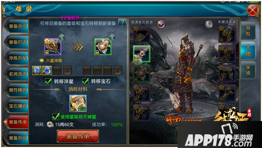 当准备好新职业的主副武器后我们可以在练鼎系统的装备传承里将原有武器的星级与宝石转移到新职业的武器上。不过需要注意的是如果你是物攻转法攻职业或者是法攻转物攻职业,你的宝石也是需要改变的。
