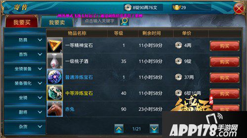 第一步:打开寄售界面后,选择“我要买”一栏。寄售界面左侧显示道具分类,玩家可以根据自己的需求在左侧选取对应的分类查找,也可在搜索栏中输入物品关键词直接查找。页面右侧列表会显示道具名称、等级、剩余时间、价格等信息(这里的剩余时间是物品多久将会下架)。