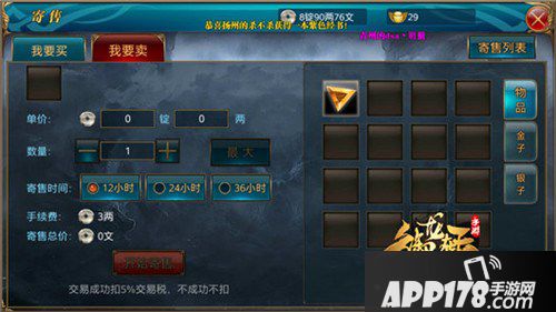 物品扣除5%的交易税,卖方上架金子,收到的银子会被征收8%的交易税,所有税都是交易成功后才会扣除,不成功不扣。银子交易不扣除税。所有物品寄售都收取3两手续费。