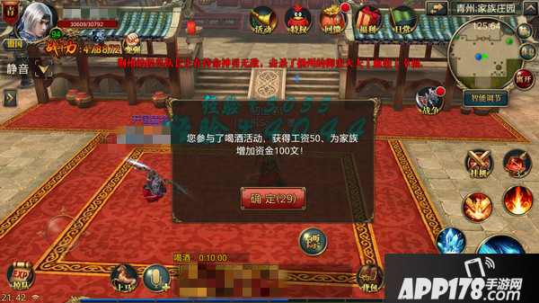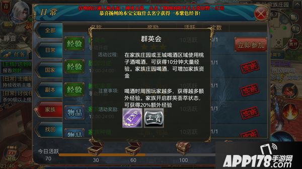 2. 家族开启【群英荟萃】任务时在30分钟内参与喝酒都会额外获得20%的经验加成;