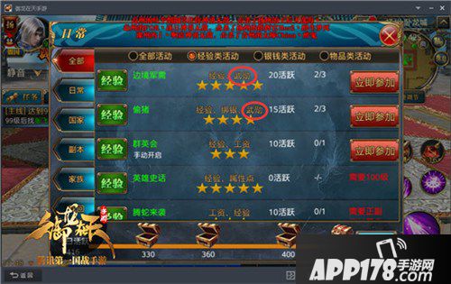 我们打开日常任务面板,就可以看到每当玩家完成一个任务会获取一定的奖励。有的任务会得到经验奖励,有的任务会得到绑银奖励,有的任务则会得到武勋奖励。在日常任务里以下这些任务都会给与或多或少的武勋奖励。它们分别是边境军需、偷猪、斩龙脉、鸡毛信、护国寺偷经、周游列国。这些任务的武勋奖励少则70多则300,如果全部完成还是很可观的。