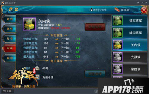 各位将军一定都知道击杀或者助攻击杀敌国的玩家会获取武勋,那么武勋是用来做什么的呢?我们点击人物头像,进入属性面板,左侧倒数第二个“军衔”选项。在“军衔”面板里我们可以看到自己今日已获得的武勋,还有当前军衔的属性及下个级别军衔所需的武勋值和属性。在面板右侧是则是军衔列表,最低级别为士卒,最高为汉寿亭侯。军衔到达一定要求时便可手动点击升级军衔,升级军衔可以提升各方面属性,并提高战斗力。而不同的军衔每日俸禄也会根据军衔的高低而提供数量不同的绑银和免做令牌。