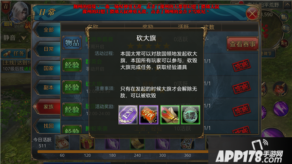 4.所有玩家都可以在主界面——日常——家族任务面板接取砍大旗任务,砍下一面大旗即可完成并获得【砍大旗任务礼包】,打开即可获得奖励;