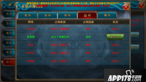 1.太常家族的族长或者副族长在家族-战斗-砍大旗点击“查看占领”按钮,选择敌国尚未攻占过的领地,点击“报名攻占”;