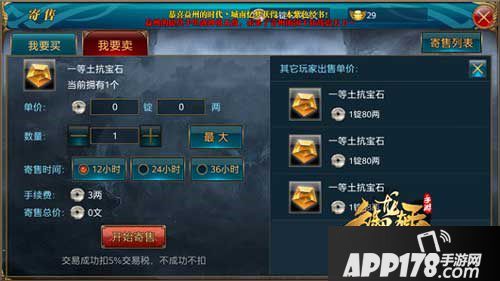 可以寄售所有包裹未绑定装备(包含人装马装)、强化材料(包含冲星宝石、镶嵌宝石、宝石合成、品质提升等)、副将、杂货等商品,同时可寄售金子银子。