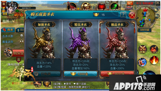 在入侵时,每位南蛮玩家都会有一件初始的南蛮圣衣,足以将人物攻击提升为平时的两倍左右,当然如果想要更加无压力的击杀原著居民,玩家们可以在南蛮界面点击购买南蛮圣衣,可供购买的分别为加强圣衣(5锭),精良圣衣(1200金子)以及极品圣衣(3600金子)。极品圣衣增加的属性更是到了增加25%以及150点攻击力,血量也有200%的提升。