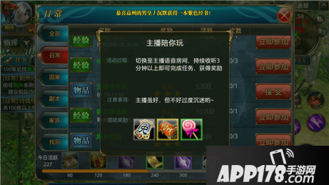 每日10:00-24:00,玩家可通过主界面日常——日常——主播陪你玩参与任务,也可以直接将主界面语音频道切换到【主播】频道即可参与,还可以与主播进行在线互动、提问、送礼物哦,每日在主播频道持续收听3分钟即可完成任务,并获得奖励如下:【免做令牌】、【黄色讨伐令】、【主播棒棒糖礼包】;