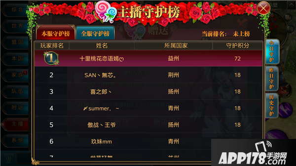 每日10:00-24:00,玩家给主播送的礼物,会在【主播守护榜】上显示并排名,【主播守护榜】分为本服守护榜和全服守护榜,这两个守护榜又分为:今日守护榜、昨日守护榜和历史守护榜,玩家可以在此查看自己的排名和历史记录;