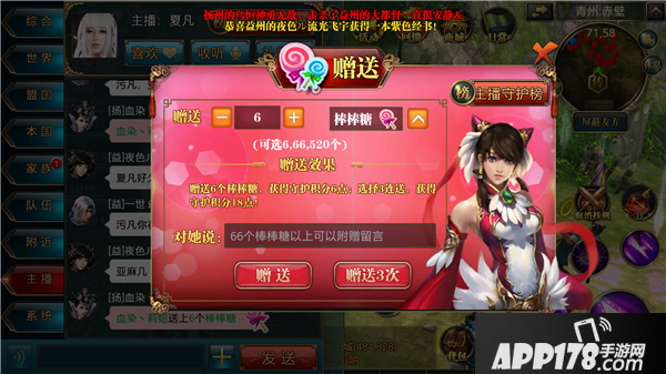 每日10:00~24:00,玩家可以在【主播】聊天频道为主播送礼物,送礼所需的道具【棒棒糖】可以通过每日的任务【主播陪你玩】获得或者通过商城购买;